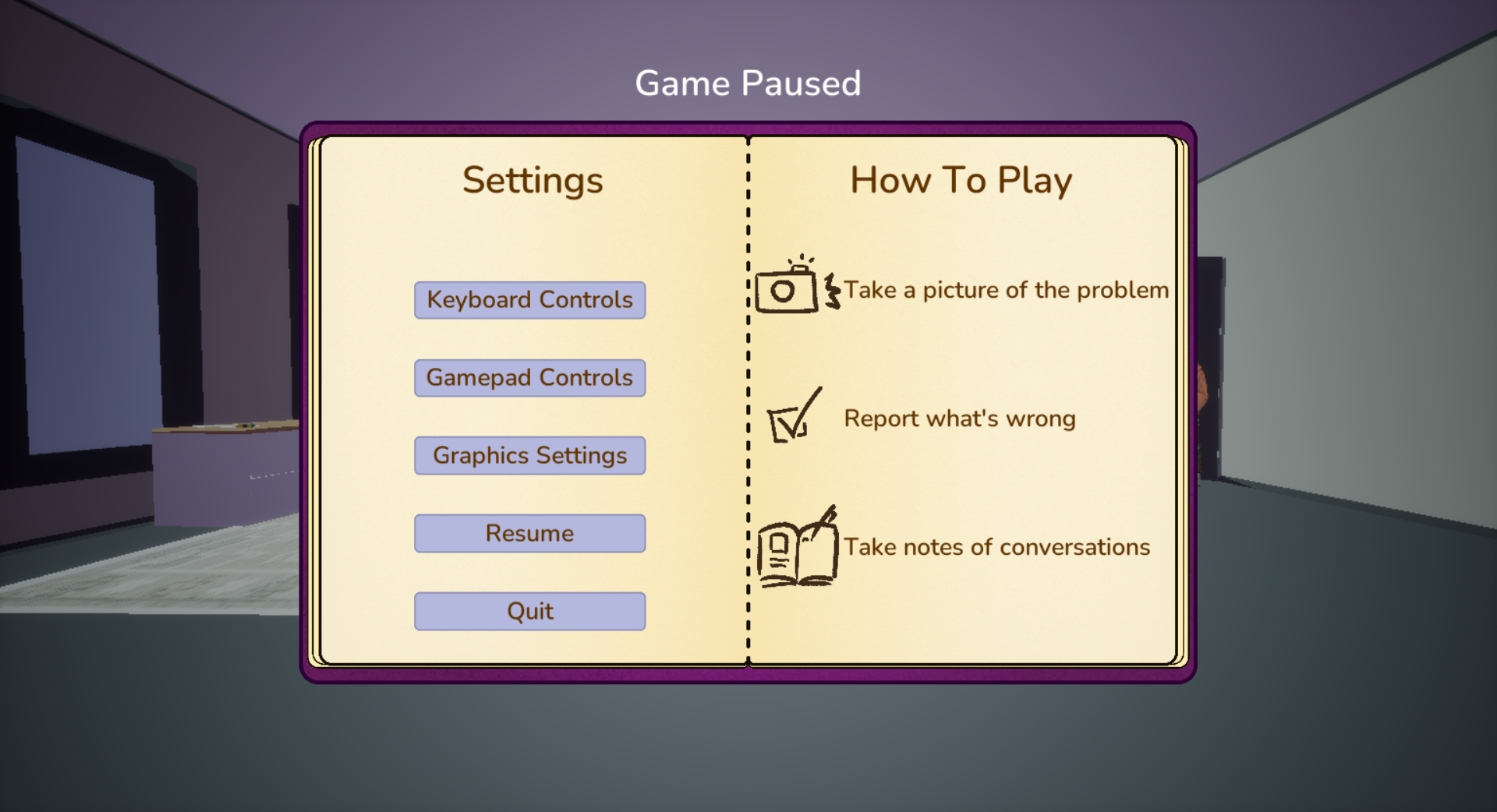 Esc - open pause menu, close menus, and can exit the game